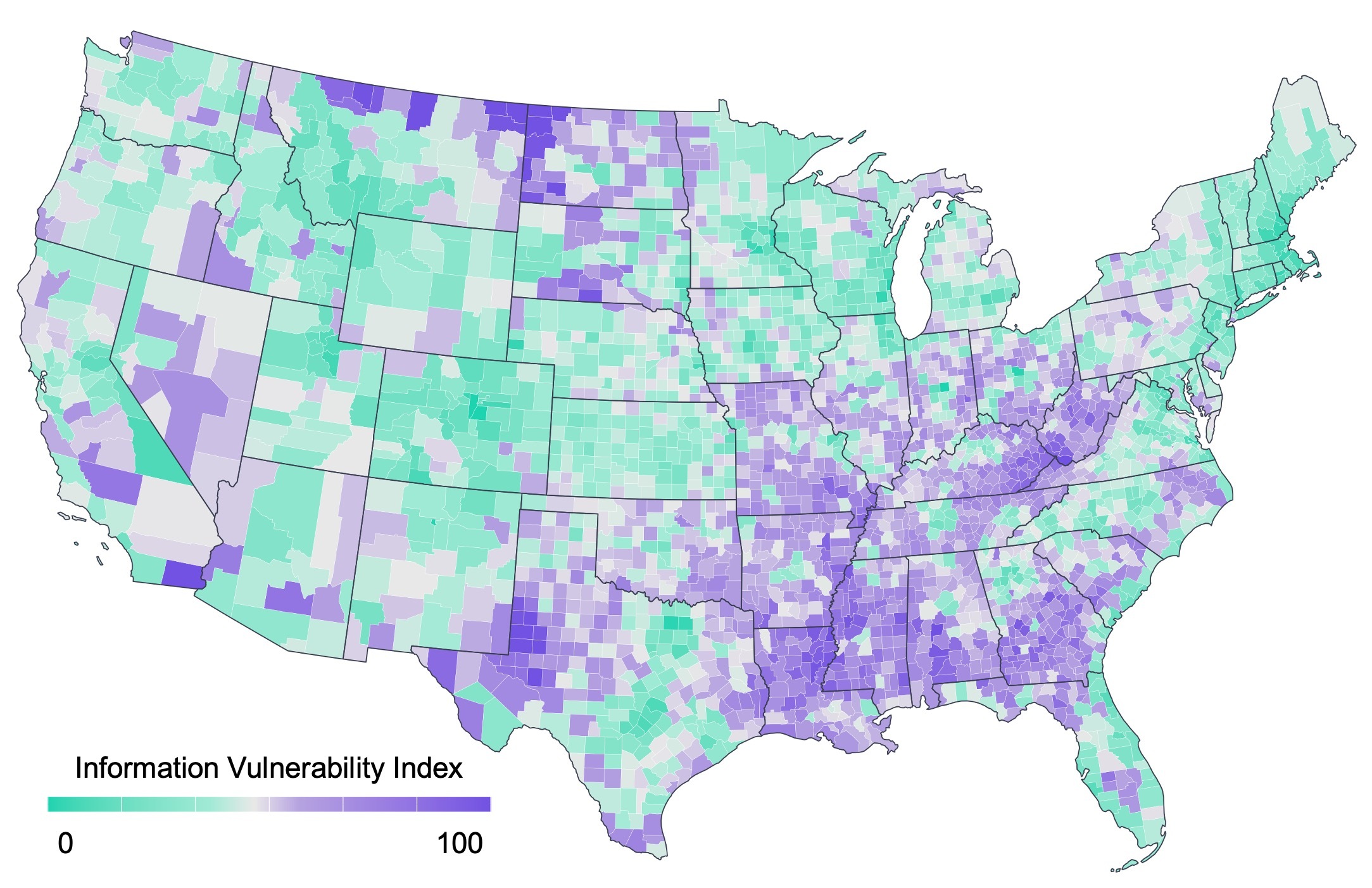 The result is a composite score for every state, congressional district, county, and even census tract in the country. Each score can be decomposed into its five pillars, revealing not just where information vulnerability is highest (or lowest) but why. For instance, as you will see below, clear geographic patterns of economic disenfranchisement become immediately visible at the county level.